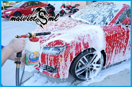 - Sau khi hoàn tất quá trình chả rửa thì dùng vòi nước xịt sạch sẽ hóa chất rửa xe, nên xịt từ trên xuống.